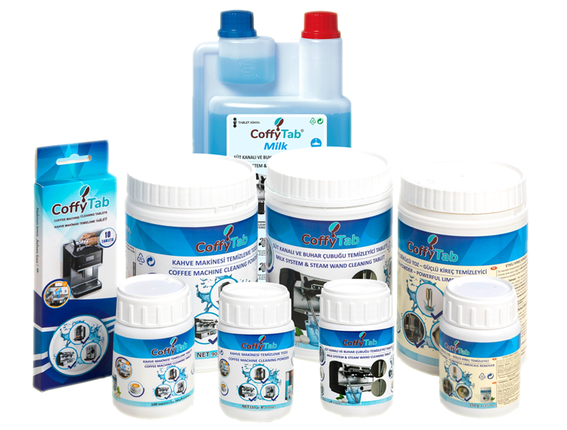 Ürün çeşitlerimiz; Kahve makinesi temizlik tabletleri, kahve makinesi temizlik tozu, süt kanalı ve buhar çubuğu temizleyici tableti, süt sistemi için sıvı temizlik solüsyonu ve kireç çözücü tozdur.